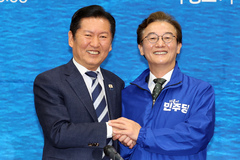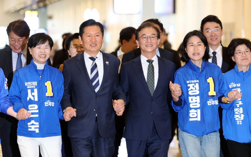 부산 지방선거 후보자들과 입장하는 정청래
