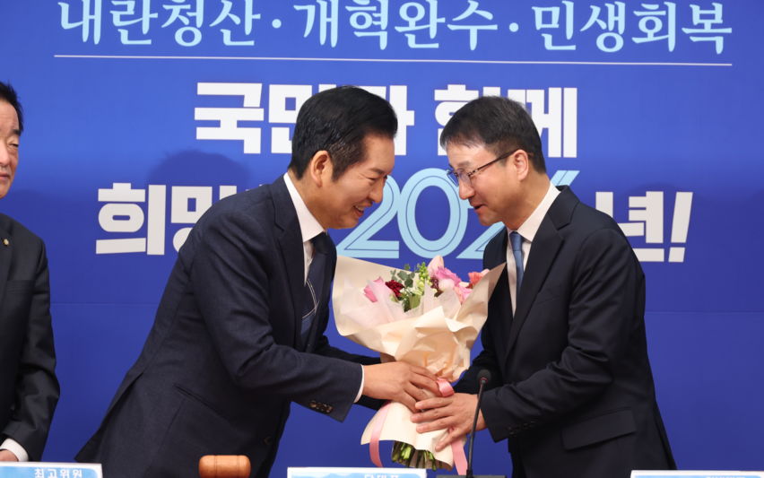 한병도 원내대표에게 꽃다발 전달하는 정청래 대표