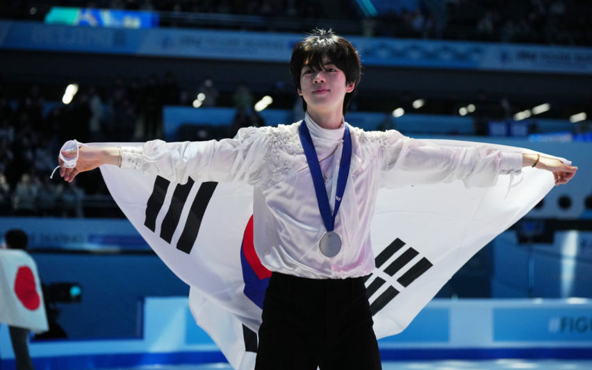 태극기 두르고 세리머니하는 차준환