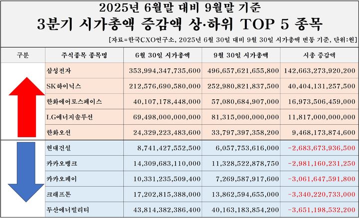 [서울=뉴시스]이인준 기자 = 올해 3분기 국내 주식시장이 삼성전자와 SK하이닉스 등 대장주들의 상승에 힘입어, 시가총액(시총)의 크기가 3200조원에 육박하는 수준으로 불었다. 다만 종목별로 보면 절반 이상이 전 분기 대비 하락세를 나타내 희비가 갈렸다.
