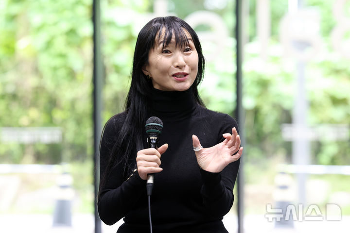 [서울=뉴시스] 박진희 기자 = 서울시발레단 안무가 허용순이 22일 서울 용산구 서울시발레단 연습실에서 작품 ‘Under The Trees’ Voices’ 기자간담회를 하고 있다. 서울시발레단은 오는 30일부터 11월 2일까지 서울 세종문화회관 세종M씨어터에서 안무가 한스 판 마넨의 ‘캄머발레’와 허용순의 ‘Under The Trees’ Voices’ 더블 빌로 2025 시즌 피날레를 장식한다. 2025.10.22. [email protected]