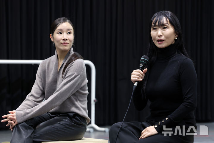 [서울=뉴시스] 박진희 기자 = 서울시발레단 안무가 허용순이 22일 서울 용산구 서울시발레단 연습실에서 작품 ‘Under The Trees’ Voices’ 기자간담회를 하고 있다. 서울시발레단은 오는 30일부터 11월 2일까지 서울 세종문화회관 세종M씨어터에서 안무가 한스 판 마넨의 ‘캄머발레’와 허용순의 ‘Under The Trees’ Voices’ 더블 빌로 2025 시즌 피날레를 장식한다. 왼쪽은 객원수석 강효정 무용수. 2025.10.22. [email protected]
