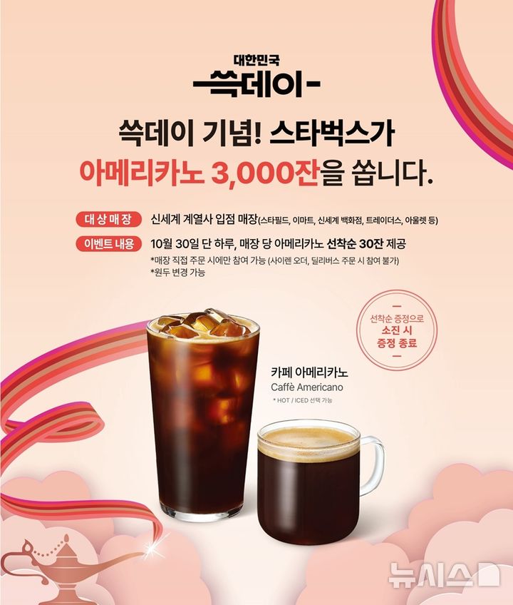 그 일환으로 쓱데이 행사 첫 날인 30일 하루 동안 아메리카노 3000잔을 무료로 제공한다. 이마트와 스타필드, 신세계백화점, 신세계사이먼 아울렛 등에 입점한 스타벅스 매장 100여 곳에서 각 30명씩 선착순으로 준다.