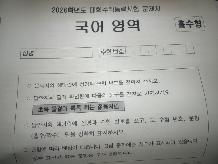 13일 오전 공개된 2026학년도 수능 국어 영역 문제지에 적힌 필적 확인 문구는 안규례 시인의 시 '아침 산책'의 한 구절인 '초록 물결이 톡톡 튀는 젊음처럼'으로 나타났다.