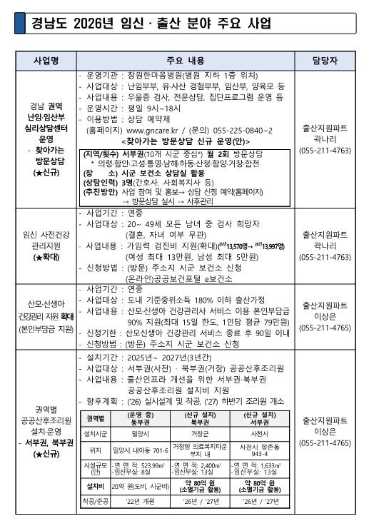 앞서 경남도는 2022년부터 동부권(밀양)에 공공산후조리원을 개소해 연간 운영비 6억원을 지원하고 있으며, 둘째자녀 이상을 출산한 산모와 취약계층에는 이용료 70%(1인당 112만원)를 감면하고 있다.