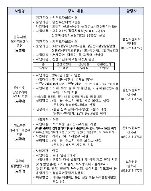 [창원=뉴시스]홍정명 기자 = 경남도는 2026년부터 임신·출산의 공공 책임 강화와 출산가정 경제적 부담 완화를 위해 임신 준비부터 출산, 영유아 성장까지 단계별 맞춤형 지원을 본격적으로 추진한다고 23일 밝혔다.